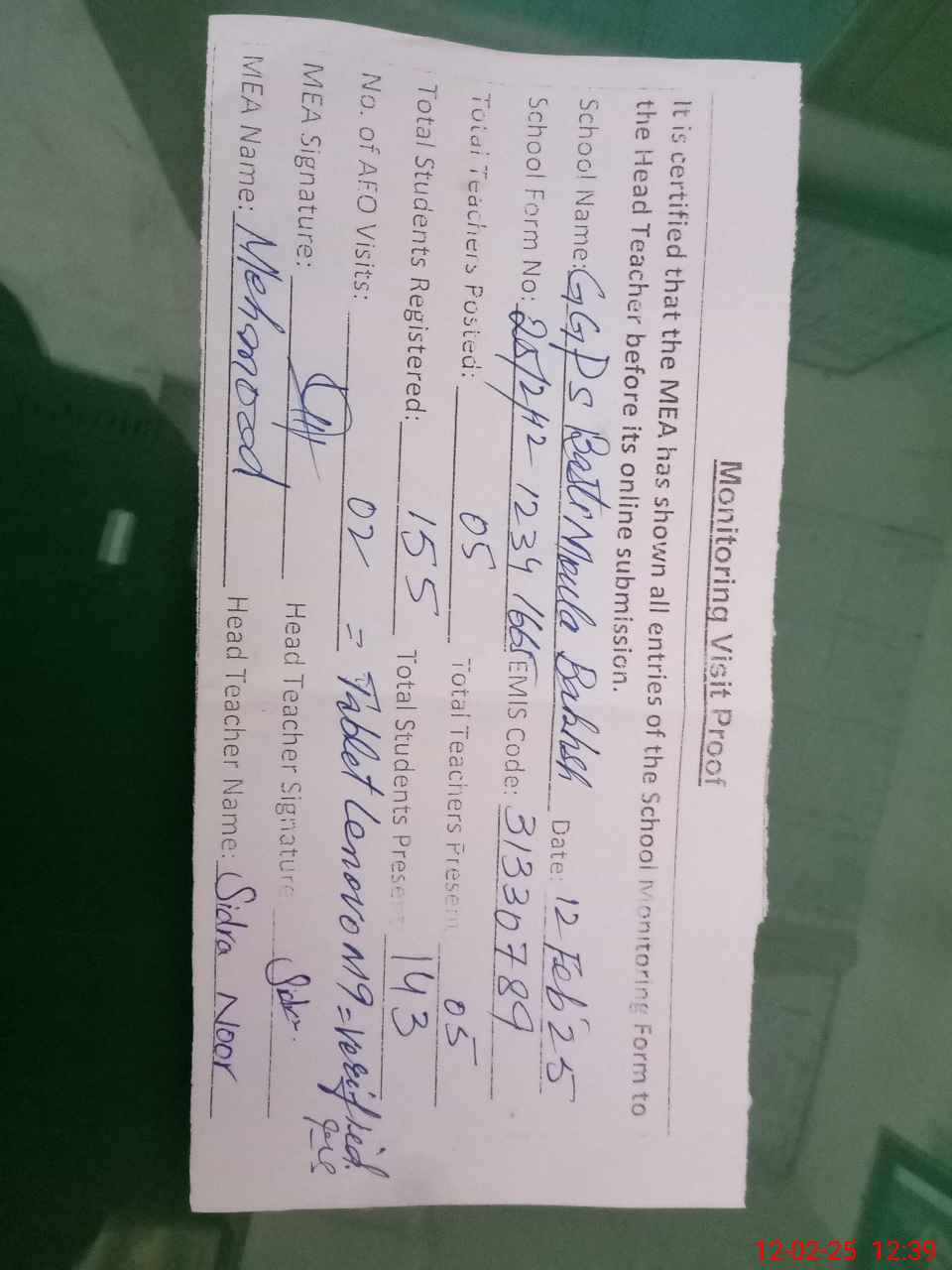 | Attendance Register | Head Teacher | MEA with School | Visit Proof |