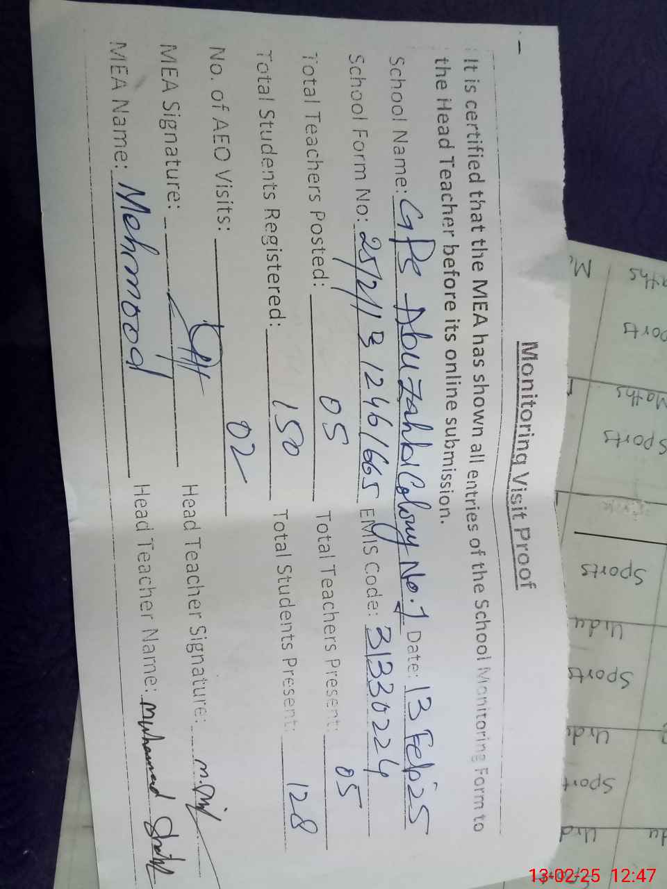 | EMIS Code: 31330224 | Name of School: GPS ABU ZAHBI COLONY NO. 1 | |||