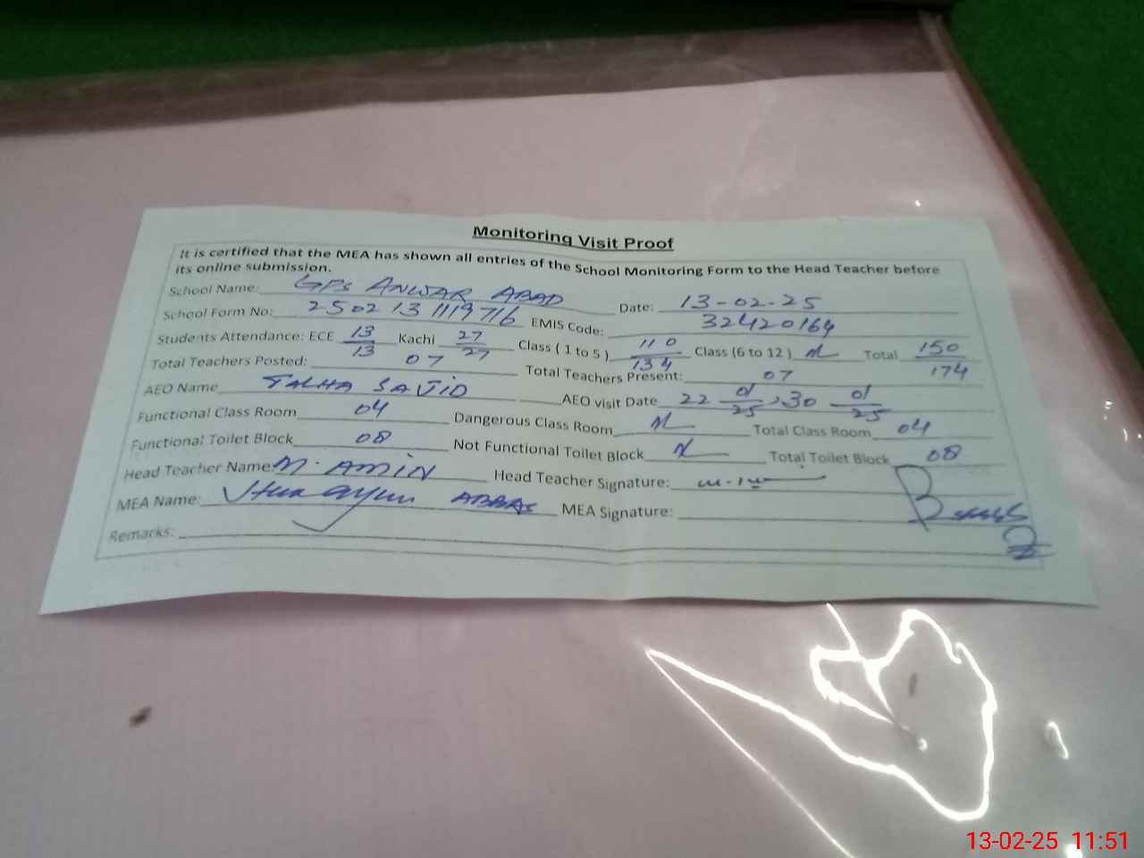 | Attendance Register | Head Teacher | MEA with School | Visit Proof |