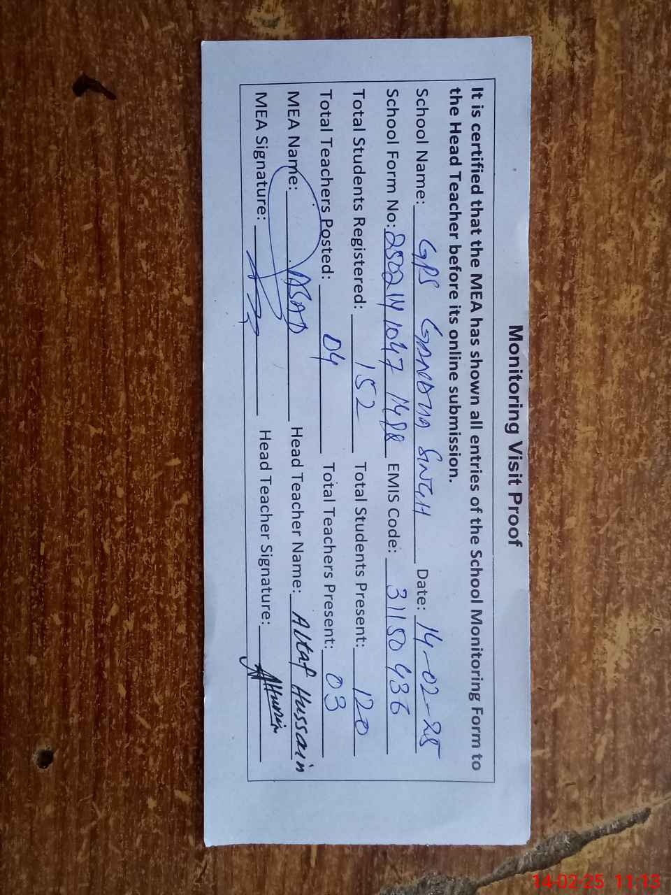 | Attendance Register | Head Teacher | MEA with School | Visit Proof |