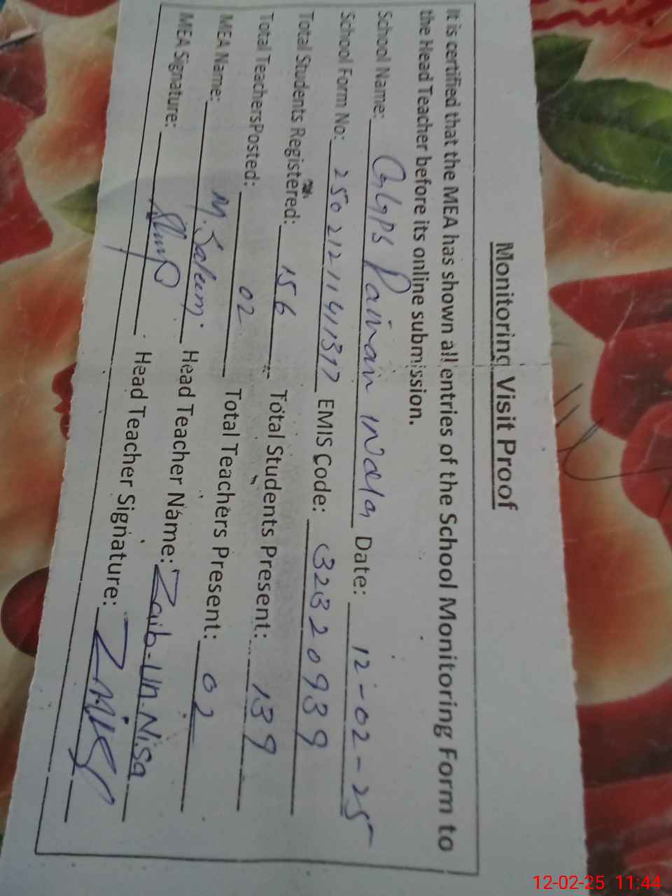 | Attendance Register | Head Teacher | MEA with School | Visit Proof |