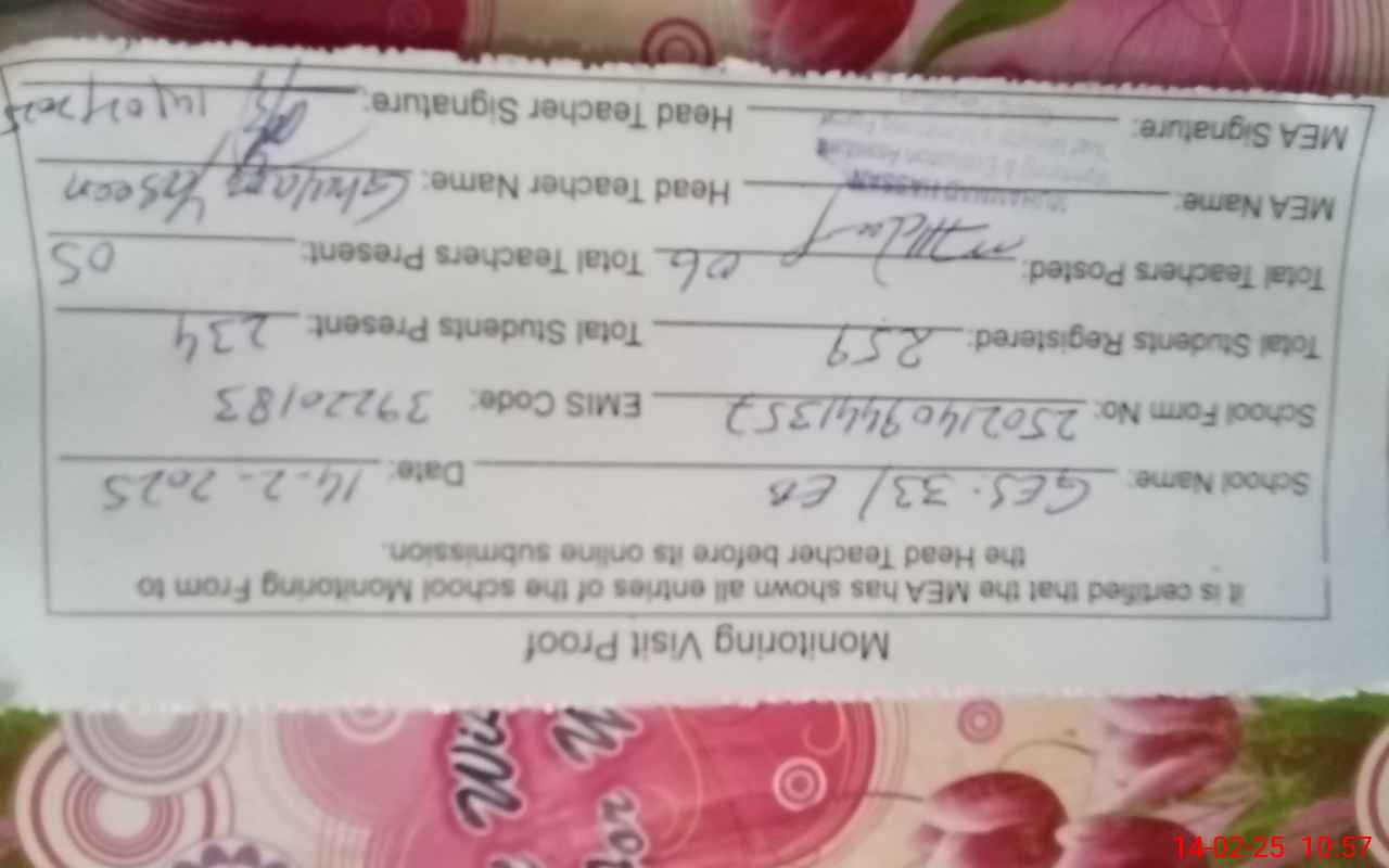 | Certified that this School was Inspected by the Undersigned MEA/DMO Today and the Information Stated Above is as Per Record. | |||||