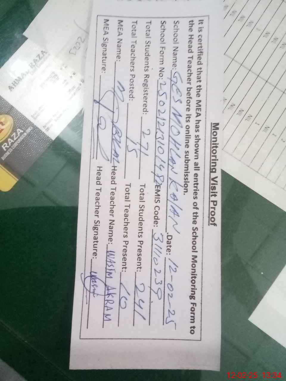 | Attendance Register | Head Teacher | MEA with School | Visit Proof |