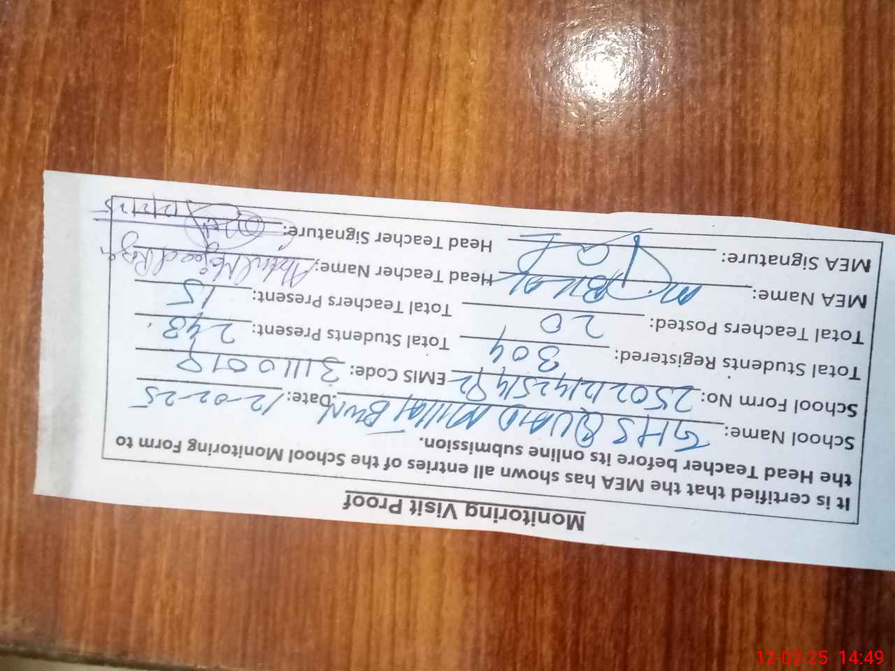 | Certified that this School was Inspected by the Undersigned MEA/DMO Today and the Information Stated Above is as Per Record. | |||||