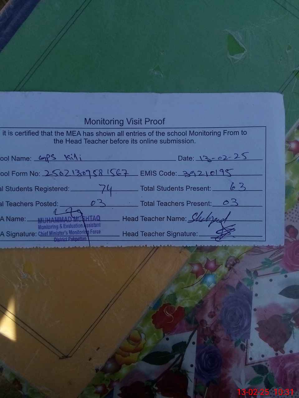 | EMIS Code: 39210195 | Name of School: GPS KILLI PO PAKPATTAN | |||