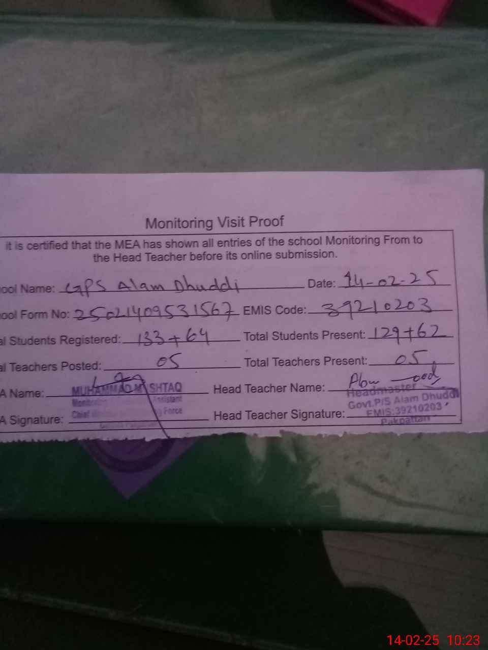 | EMIS Code: 39210203 | Name of School: GPS ALAM DHUDDI | |||