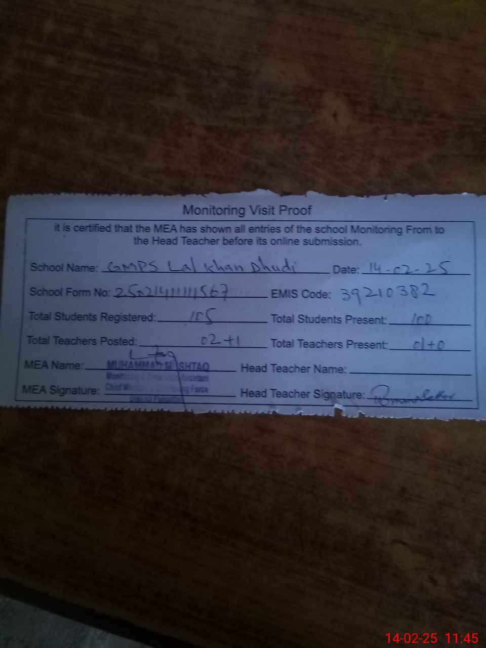 | Attendance Register | Head Teacher | MEA with School | Visit Proof |