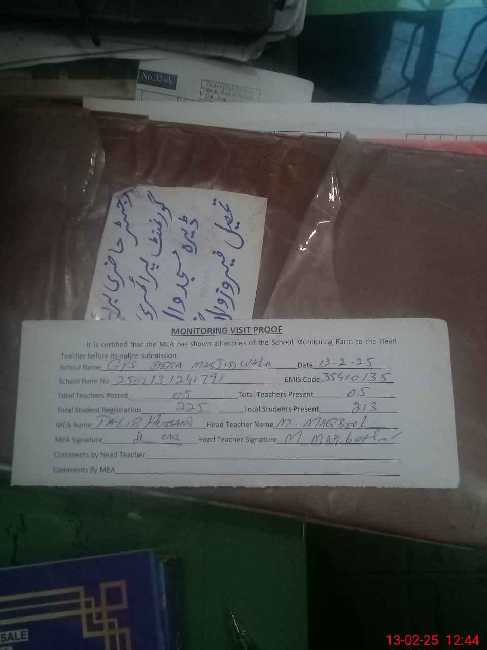 | Attendance Register | Head Teacher | MEA with School | Visit Proof |
