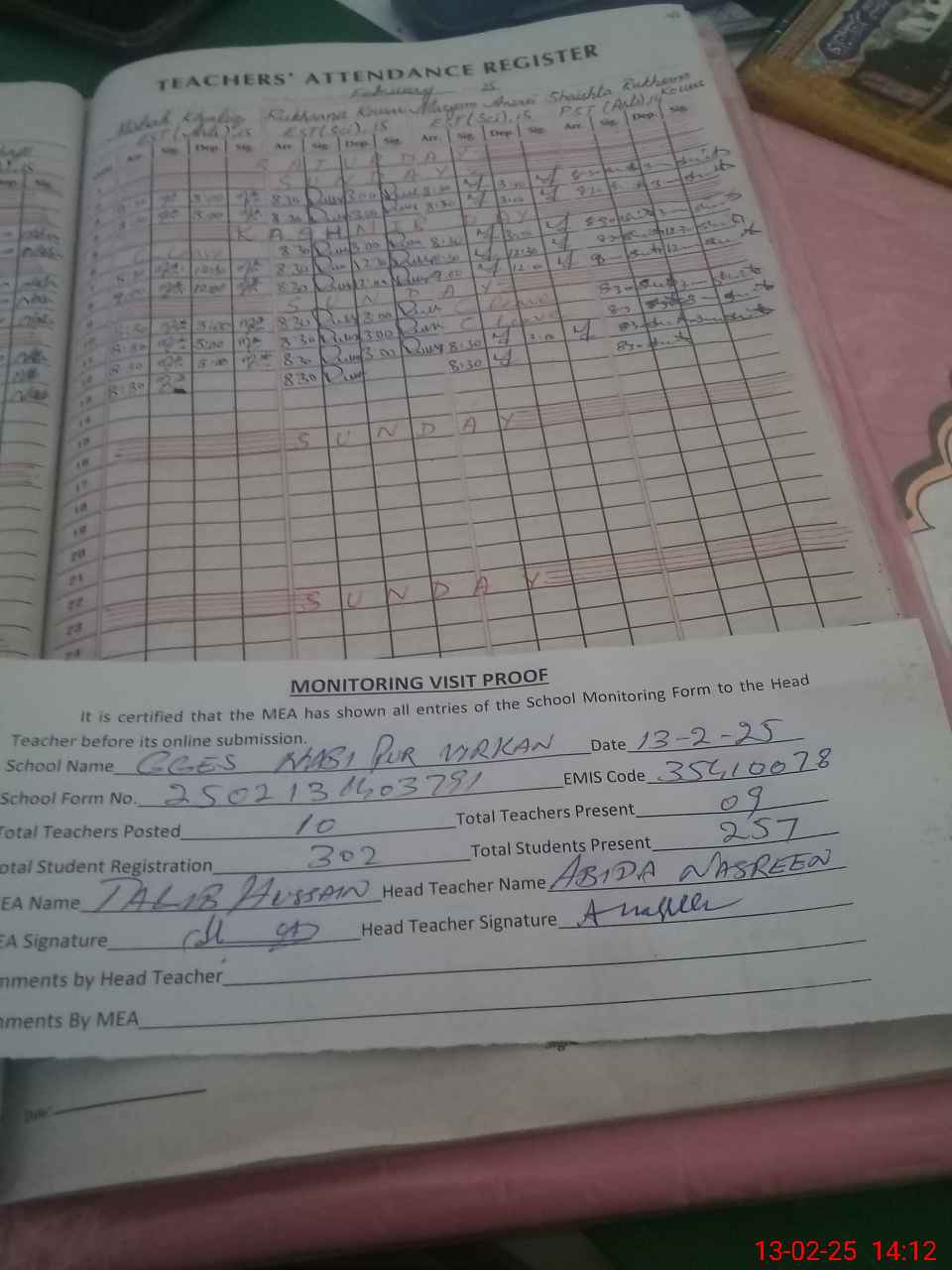 | Attendance Register | Head Teacher | MEA with School | Visit Proof |