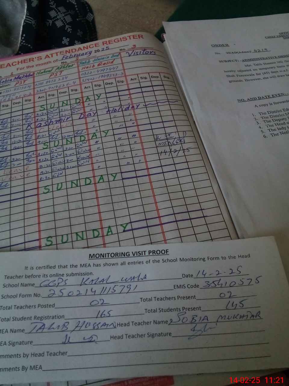 | Attendance Register | Head Teacher | MEA with School | Visit Proof |