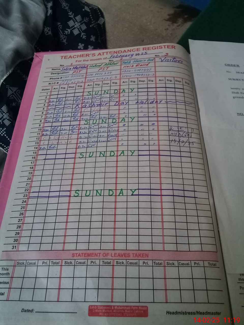 | CNIC | Full Name | Designation | R/C | Absence During Last Calender Month |