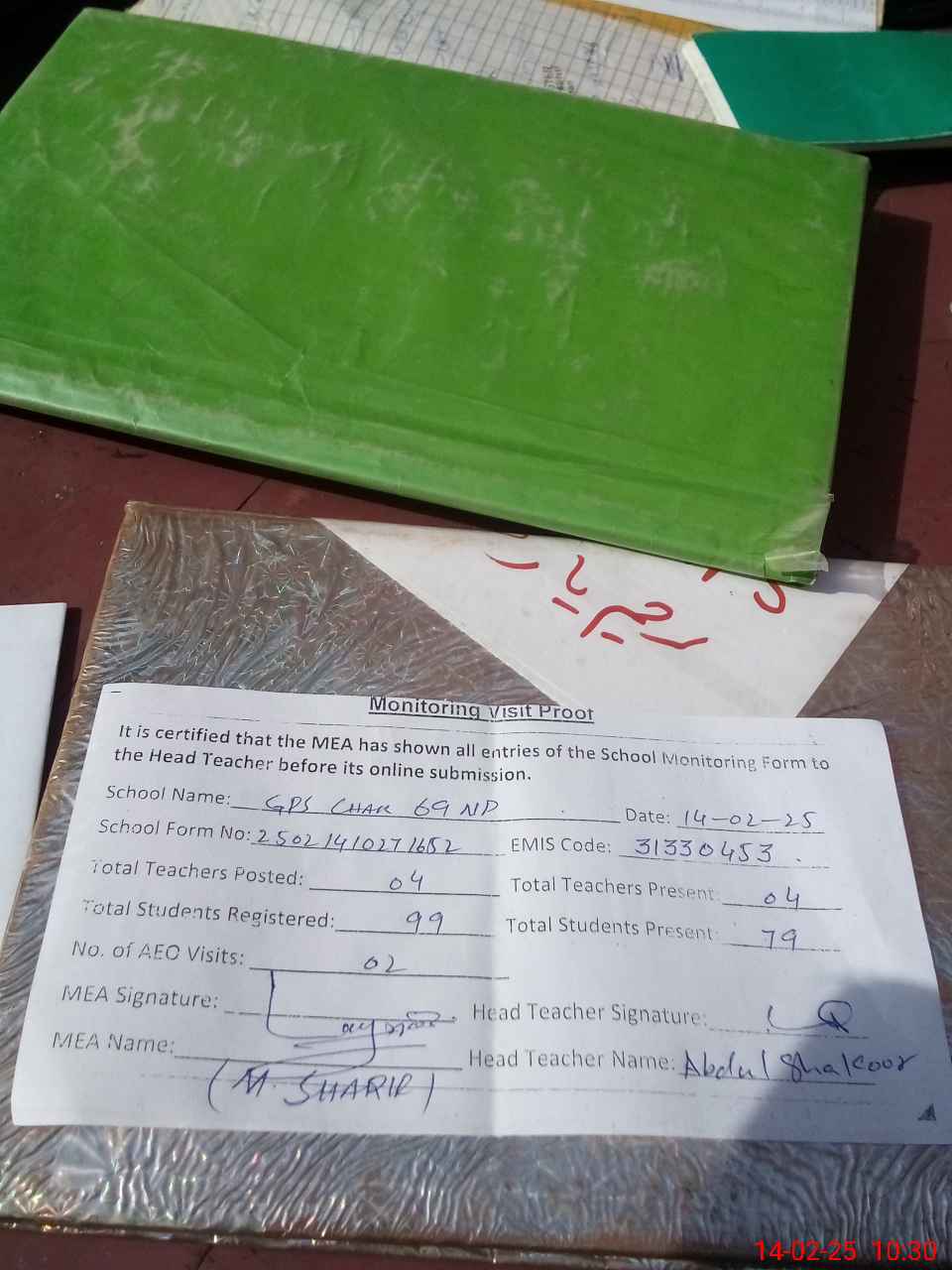 | EMIS Code: 31330453 | Name of School: GPS CHAK NO. 69/NP | |||