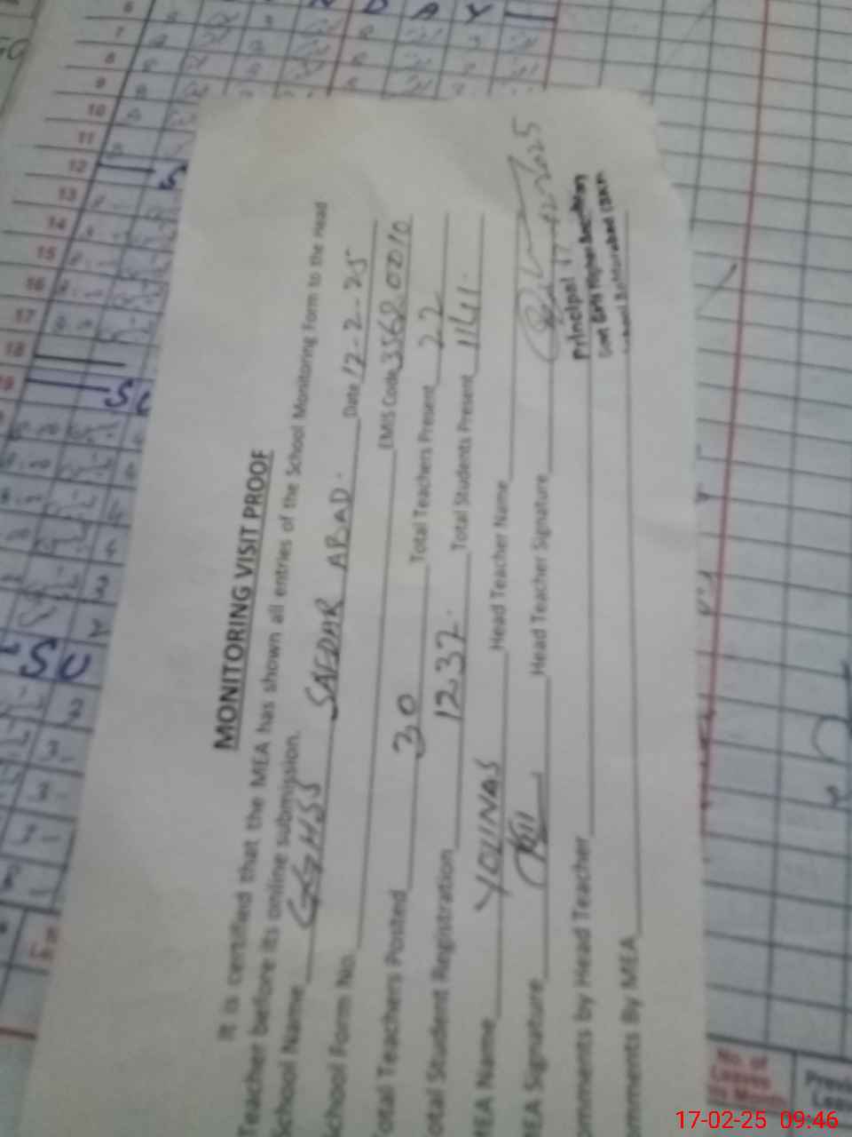 | Attendance Register | Head Teacher | MEA with School | Visit Proof |