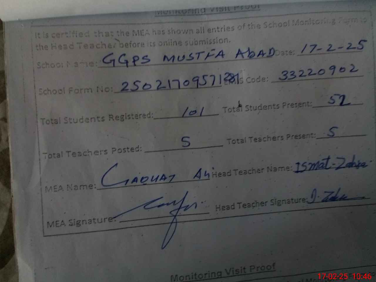 | Certified that this School was Inspected by the Undersigned MEA/DMO Today and the Information Stated Above is as Per Record. | |||||