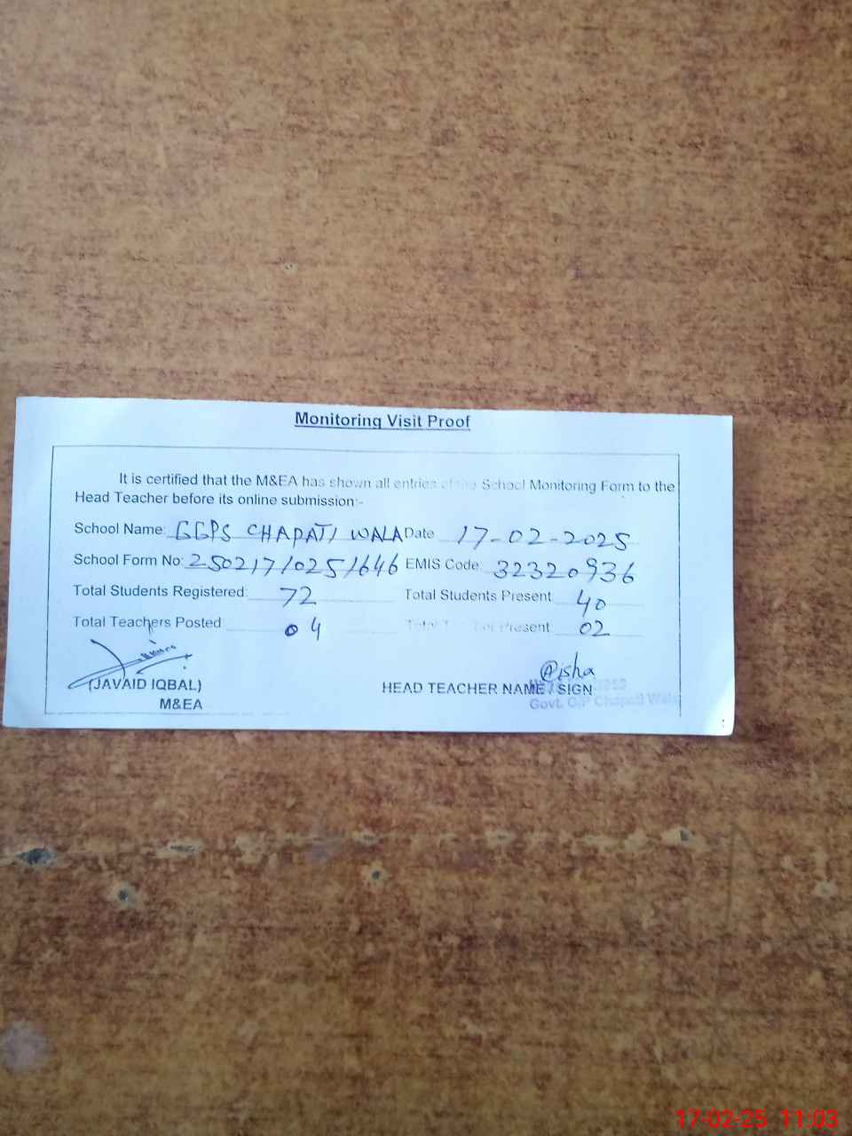 | EMIS Code: 32320936 | Name of School: GGPS CHAPATI WALA (BABA TEND DARBAR) | |||