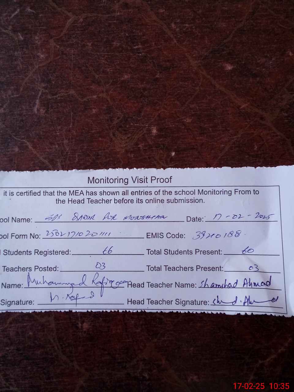 | Attendance Register | Head Teacher | MEA with School | Visit Proof |