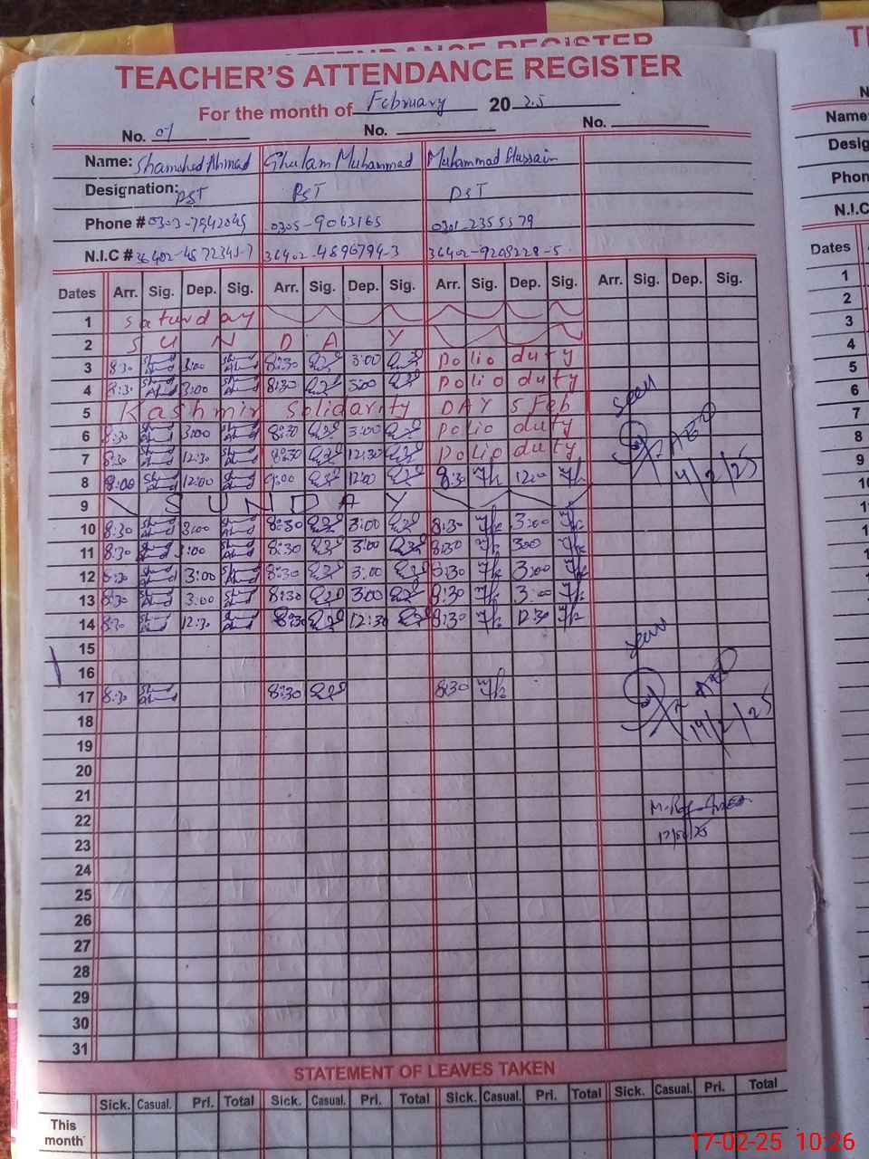 | Name: SH**** AH**** Designation: (School Headmaster's/Headmistress's) PST Phone/Cell Number: 03**** |