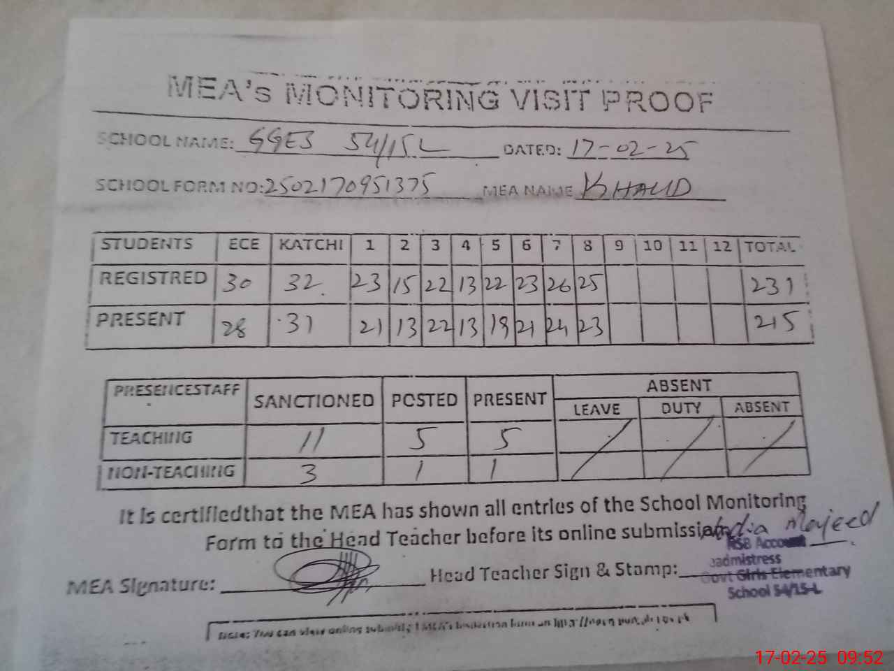 | Attendance Register | Head Teacher | MEA with School | Visit Proof |