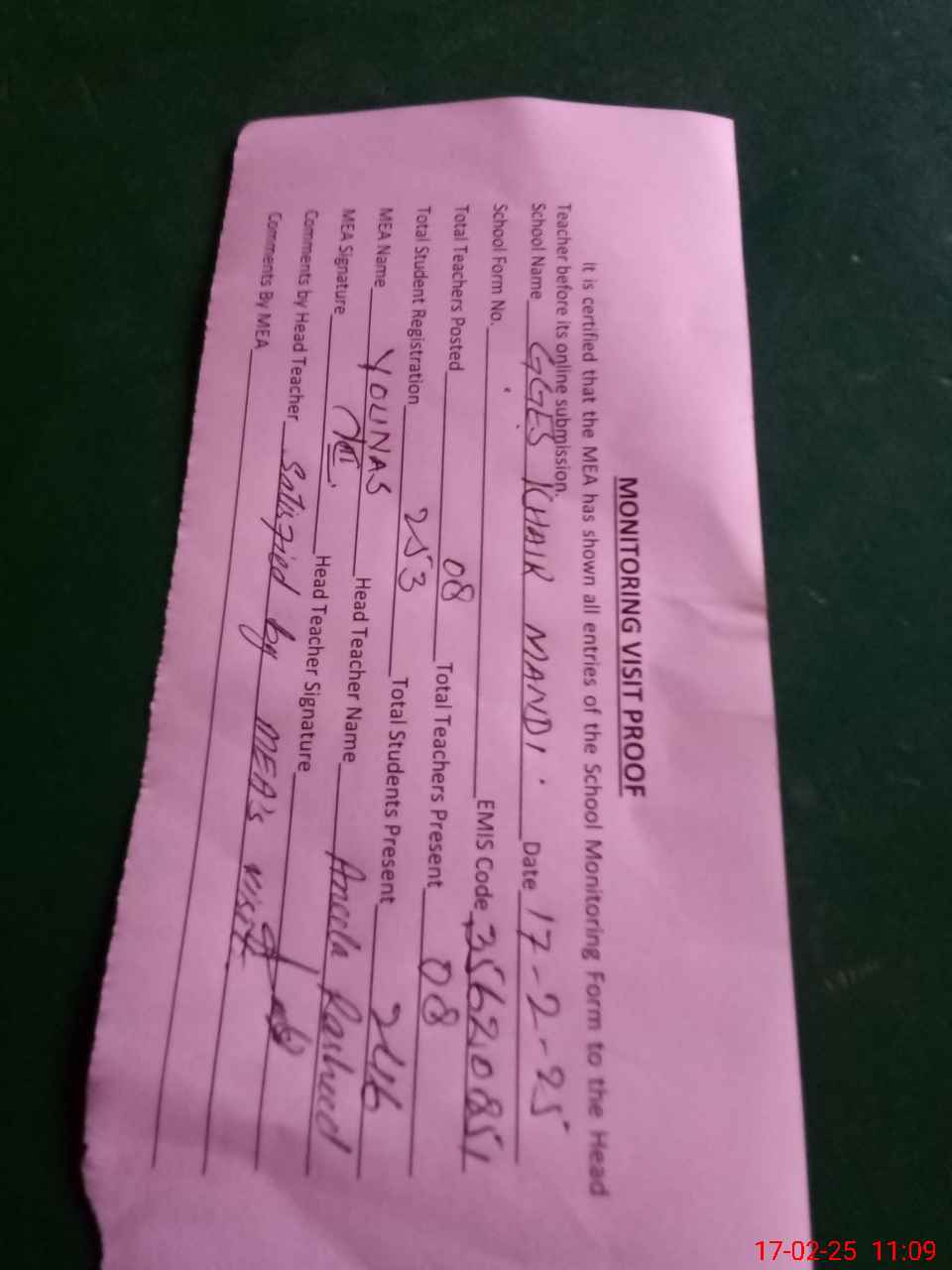 | Attendance Register | Head Teacher | MEA with School | Visit Proof |