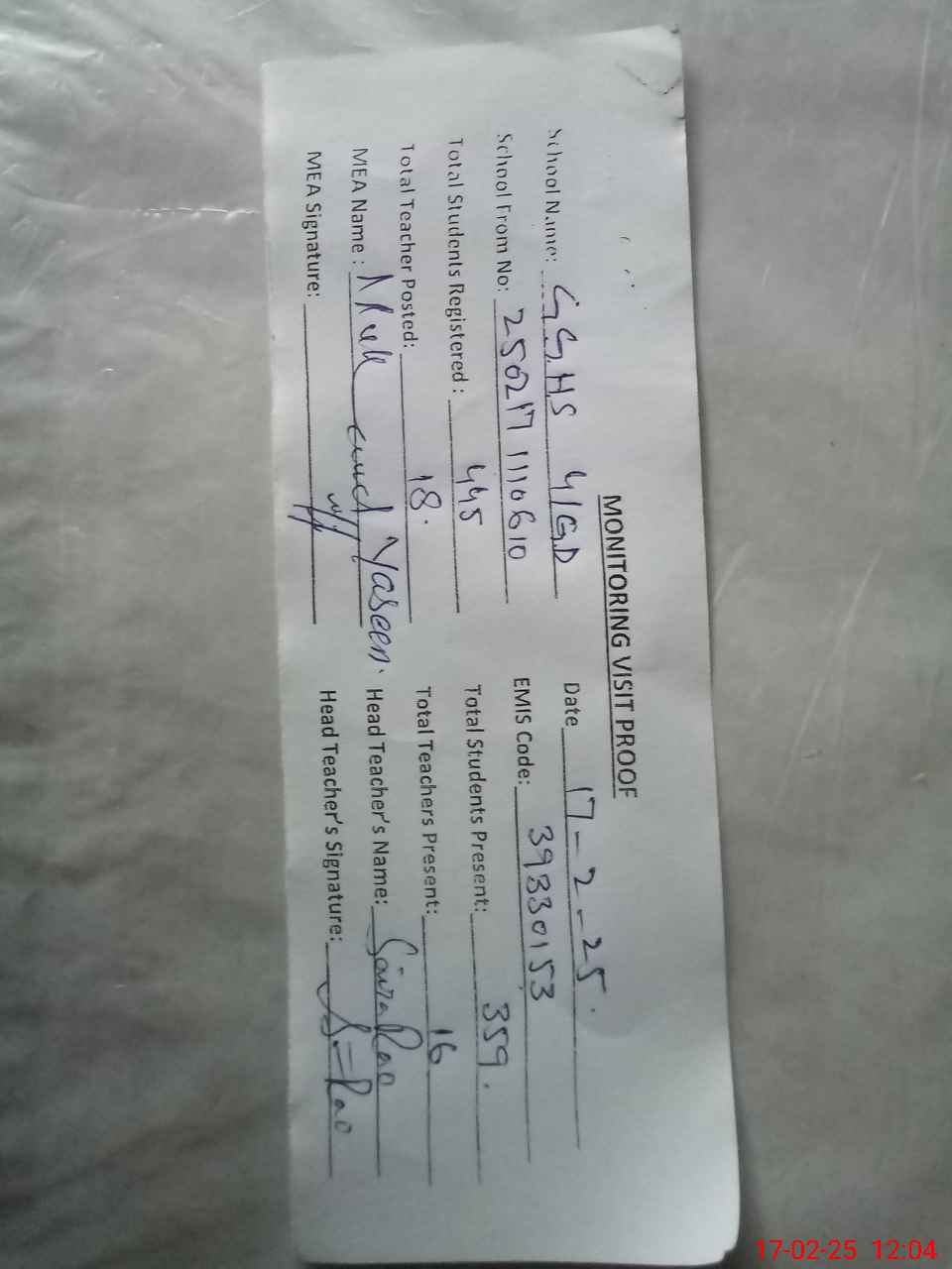 | Attendance Register | Head Teacher | MEA with School | Visit Proof |