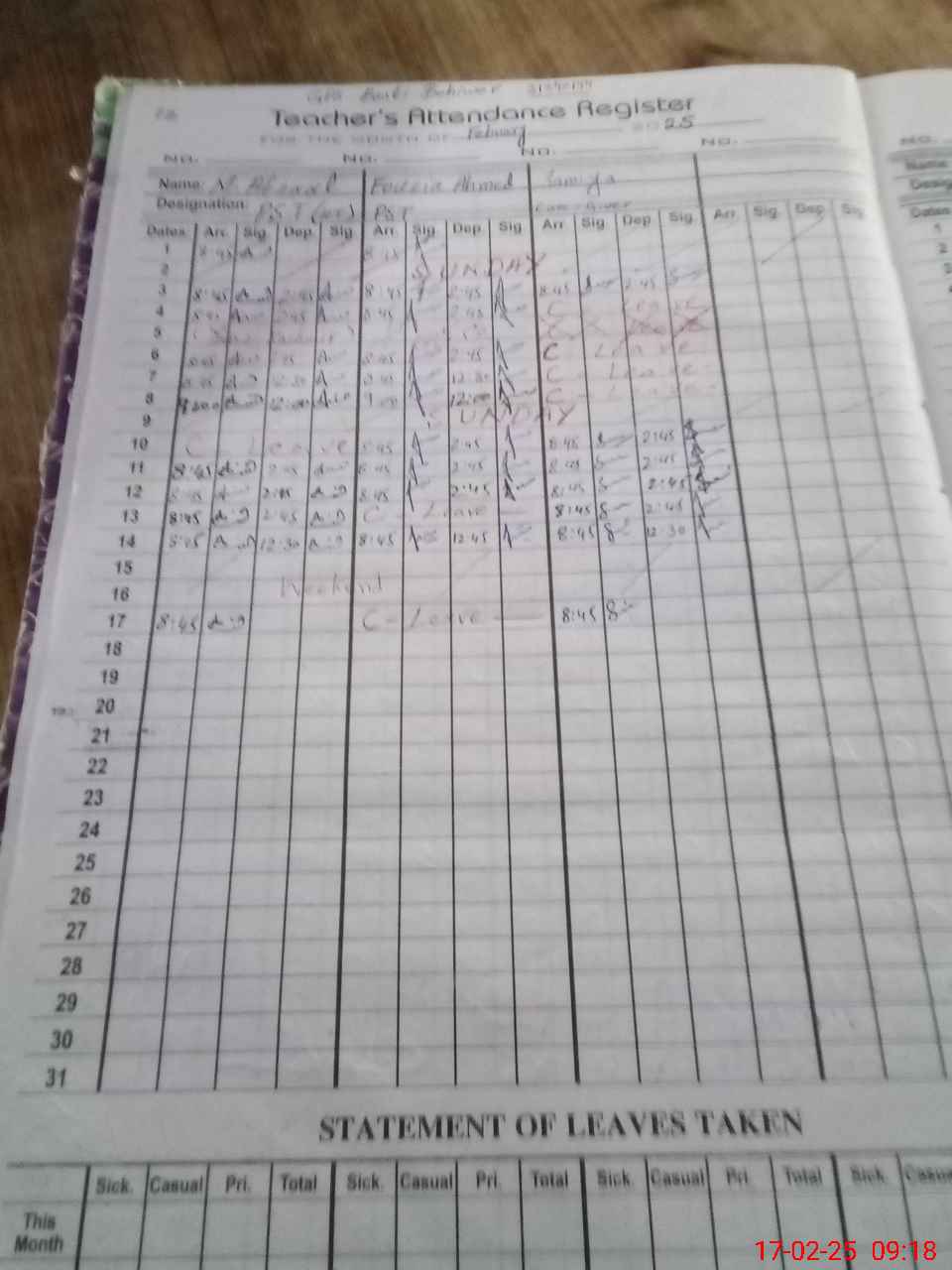 | CNIC | Full Name | Designation | R/C | Absence During Last Calender Month |