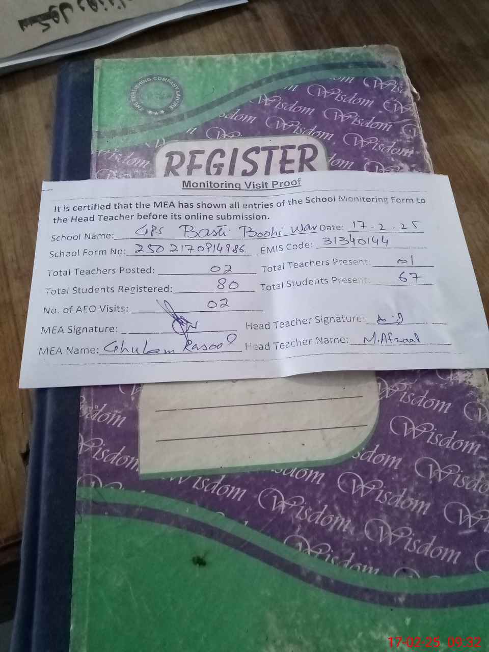 | Attendance Register | Head Teacher | MEA with School | Visit Proof |