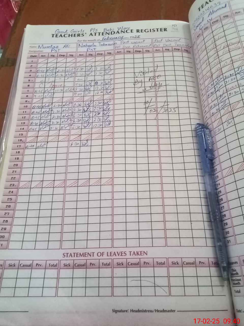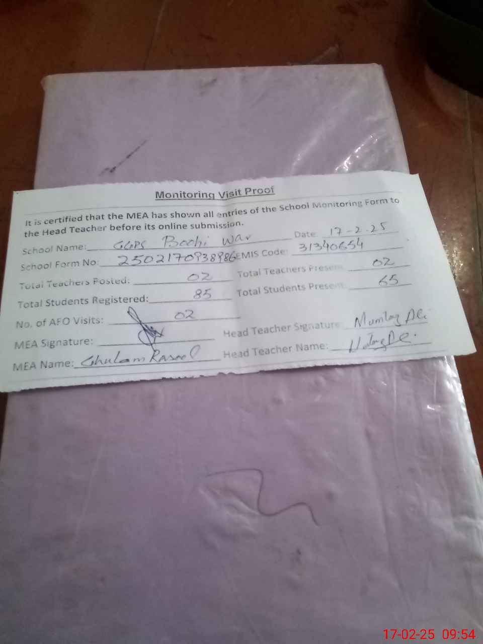| Attendance Register | Head Teacher | MEA with School | Visit Proof |