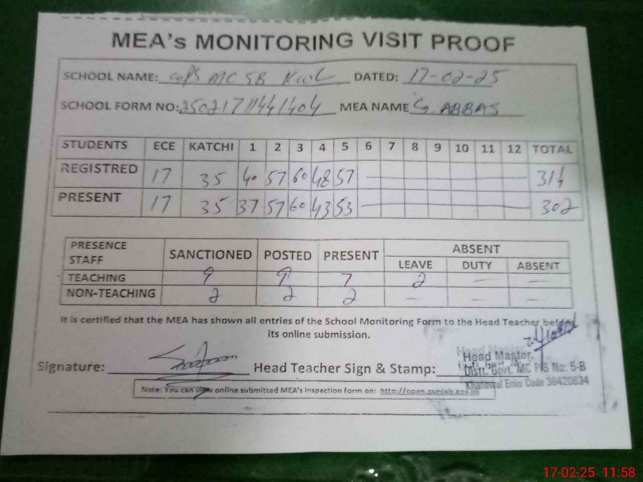 | Attendance Register | Head Teacher | MEA with School | Visit Proof |