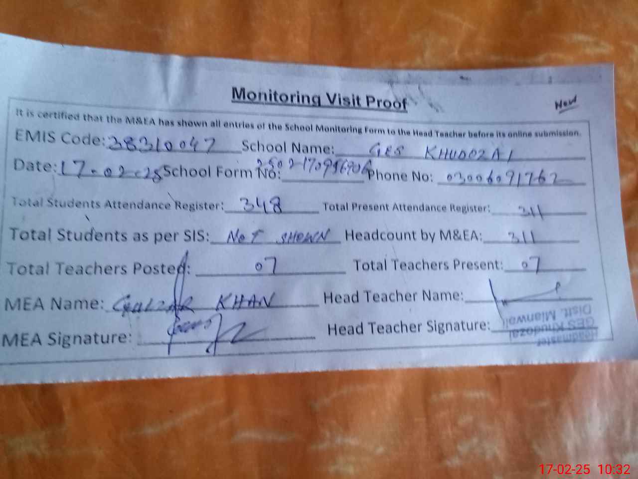 | Attendance Register | Head Teacher | MEA with School | Visit Proof |