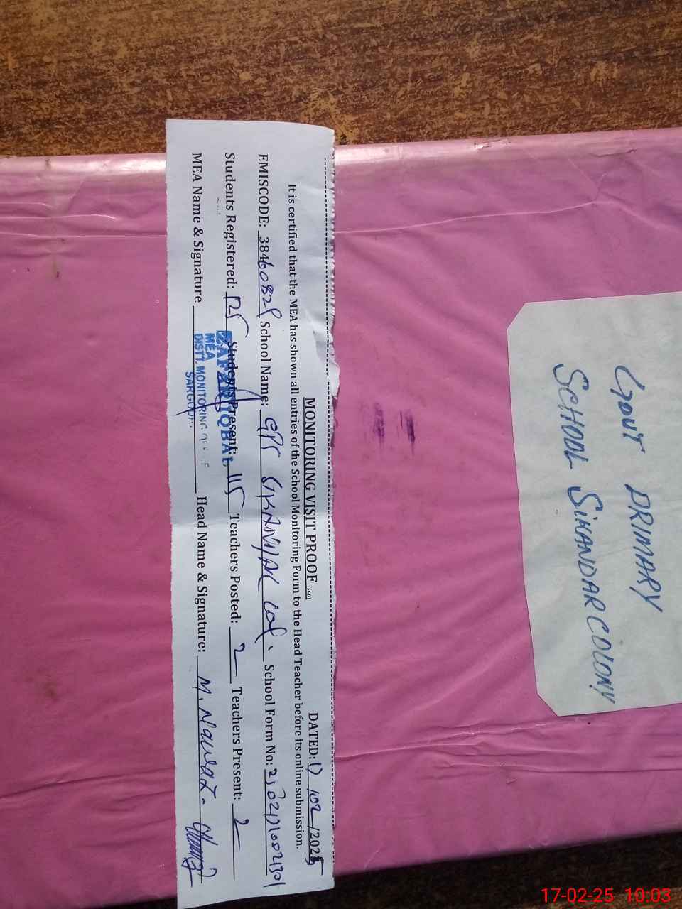 | Attendance Register | Head Teacher | MEA with School | Visit Proof |