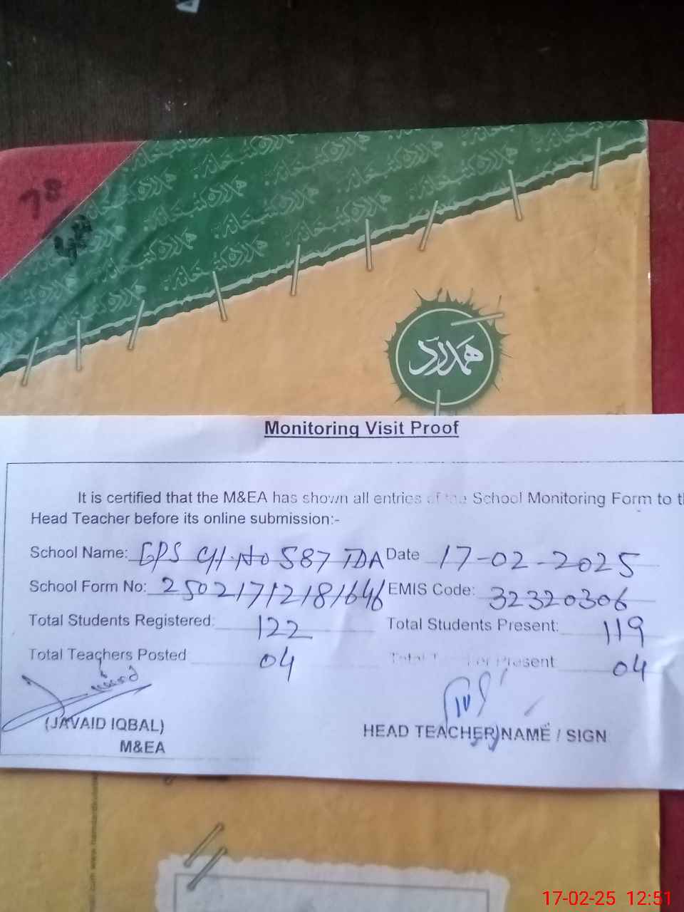 | EMIS Code: 32320306 | Name of School: GPS CHAK NO.587 TDA | |||