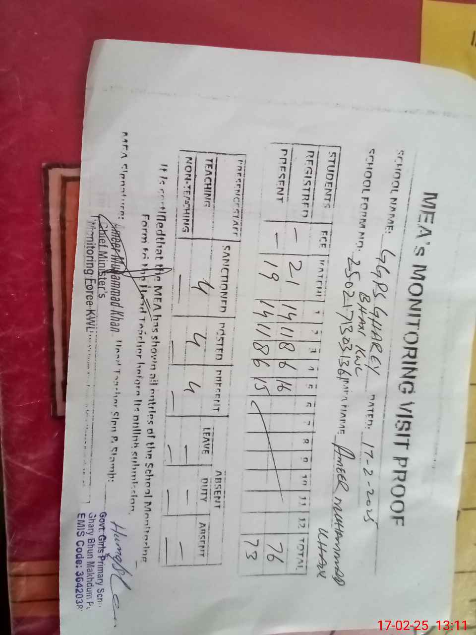 | Certified that this School was Inspected by the Undersigned MEA/DMO Today and the Information Stated Above is as Per Record. | |||||