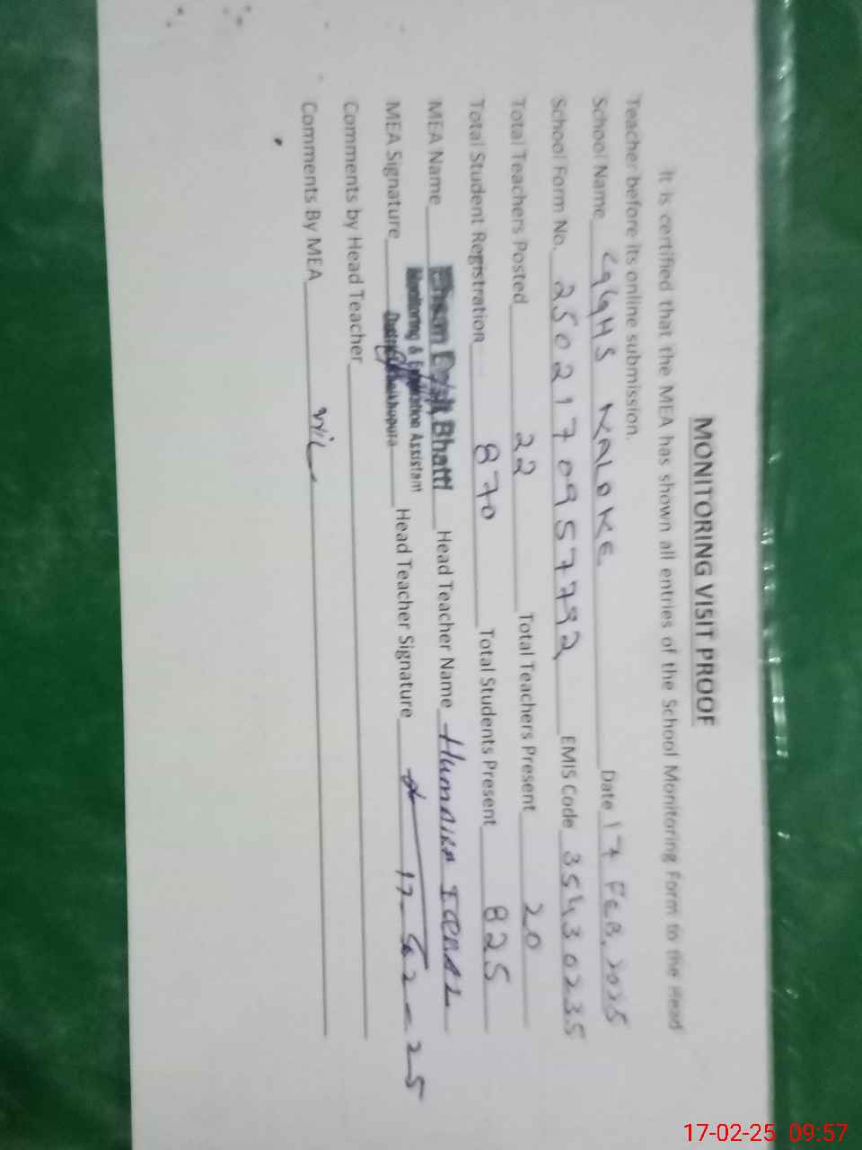 | Attendance Register | Head Teacher | MEA with School | Visit Proof |