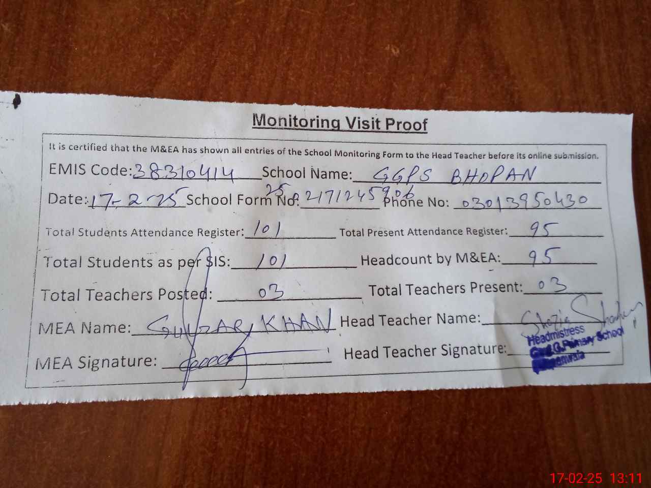 | Attendance Register | Head Teacher | MEA with School | Visit Proof |