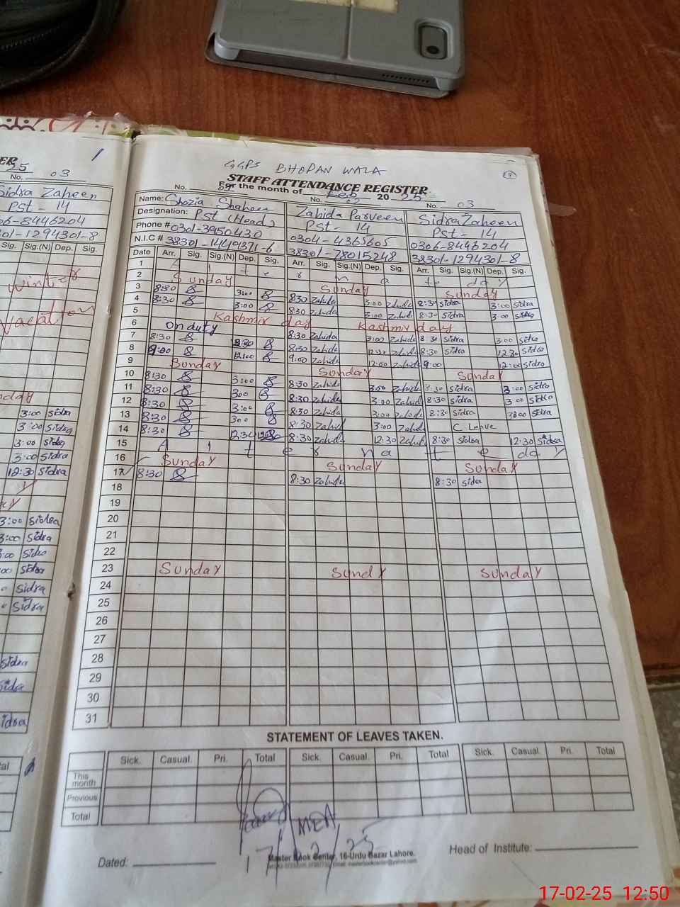 | CNIC | Full Name | Designation | R/C | Absence During Last Calender Month |