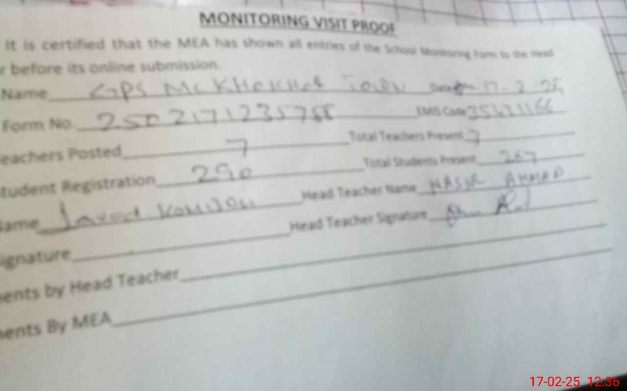 | Attendance Register | Head Teacher | MEA with School | Visit Proof |