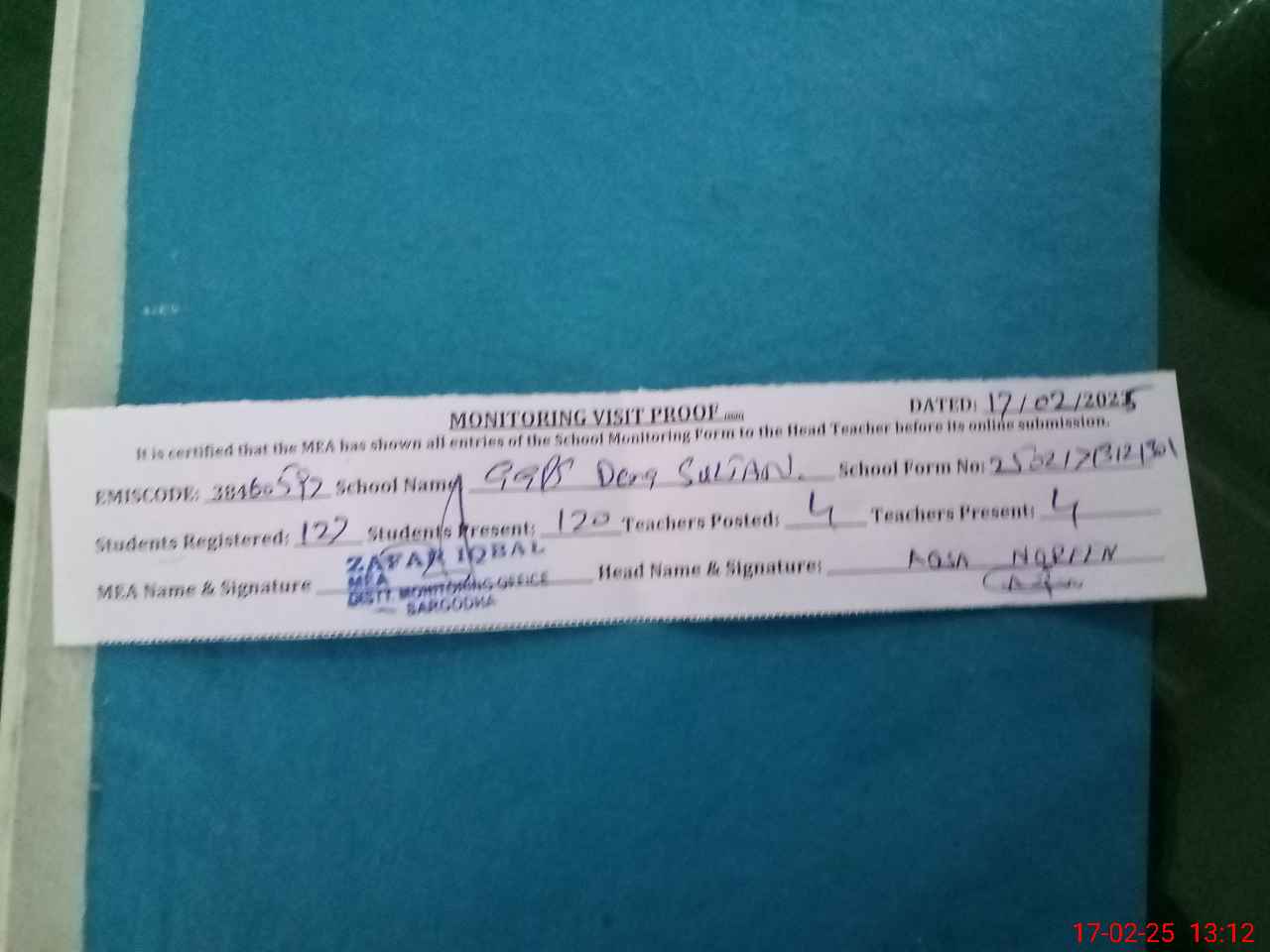 | Attendance Register | Head Teacher | MEA with School | Visit Proof |