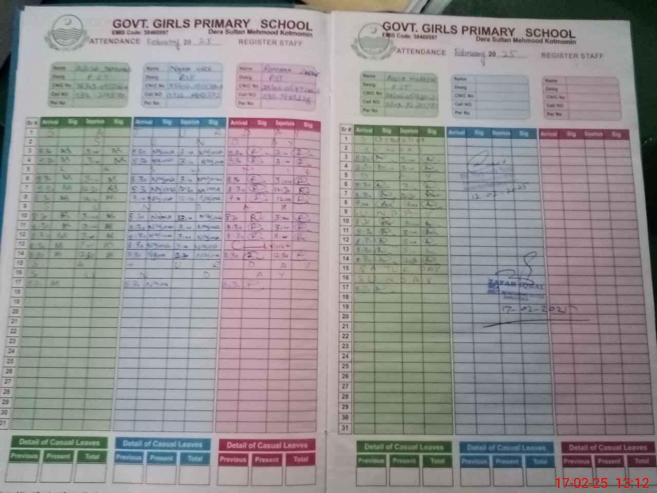 | CNIC | Full Name | Designation | R/C | Absence During Last Calender Month |