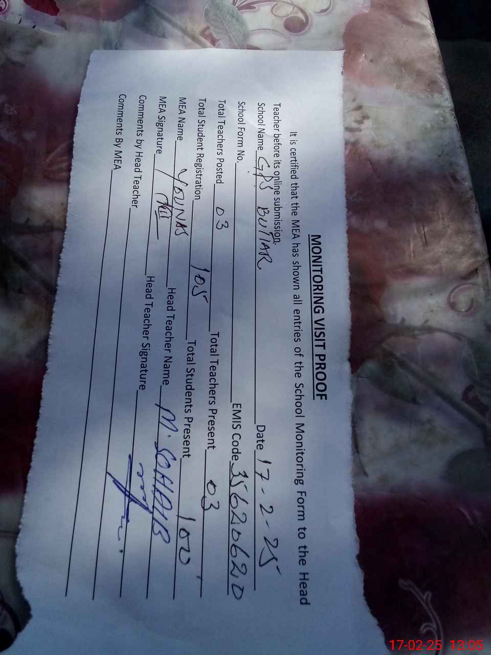 | Attendance Register | Head Teacher | MEA with School | Visit Proof |