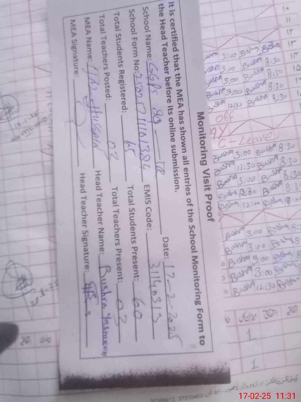 | Attendance Register | Head Teacher | MEA with School | Visit Proof |