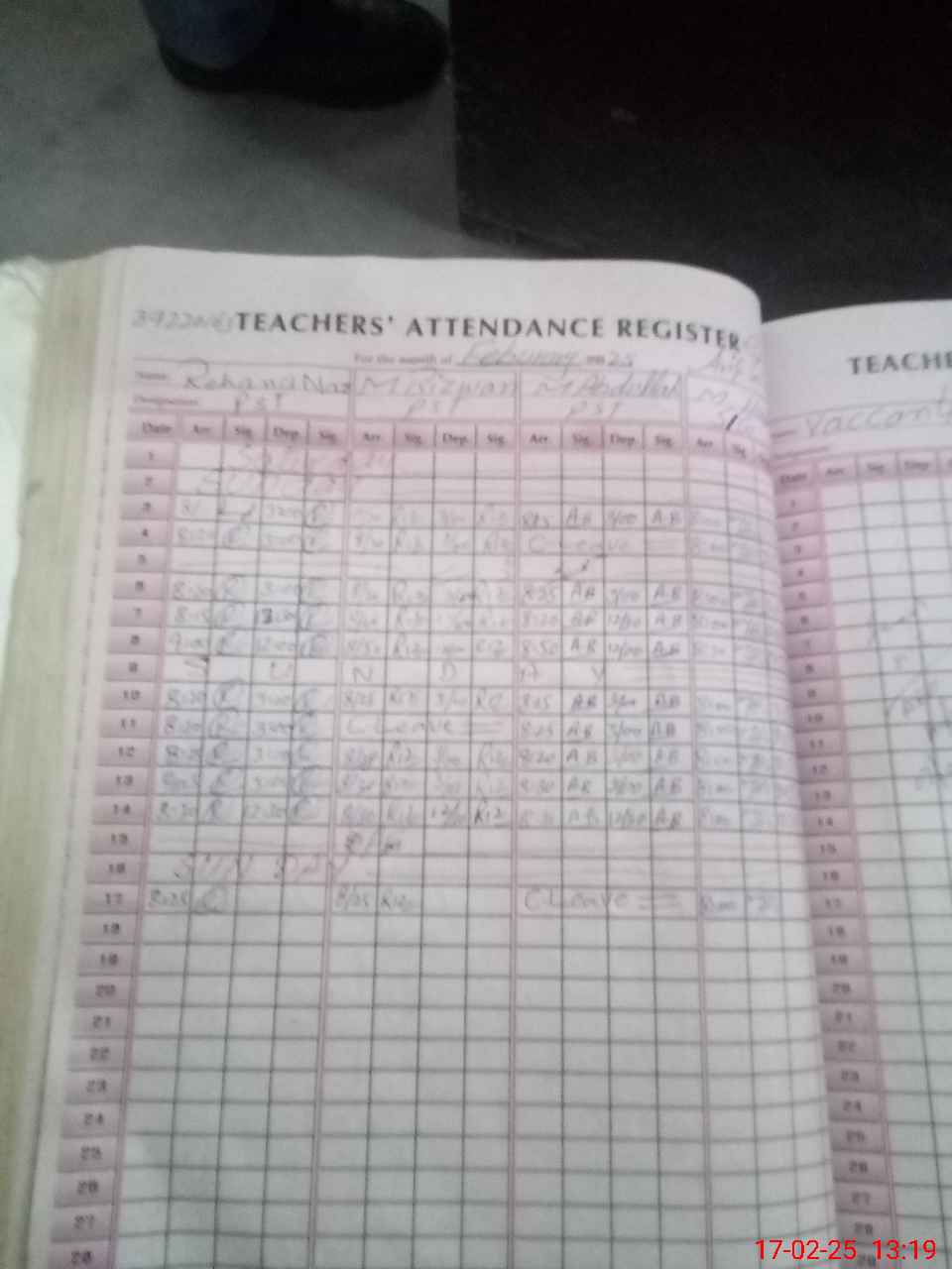 | CNIC | Full Name | Designation | R/C | Absence during last cal. month |