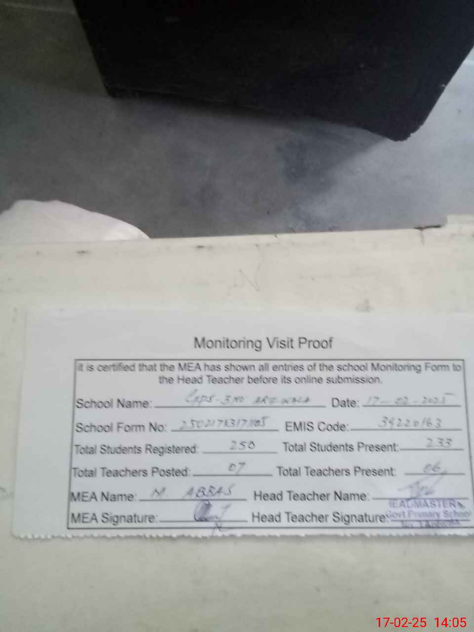 | Attendance Register | Head Teacher | MEA with School | Visit Proof |