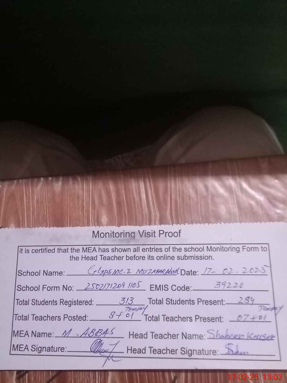 | Attendance Register | Head Teacher | MEA with School | Visit Proof |