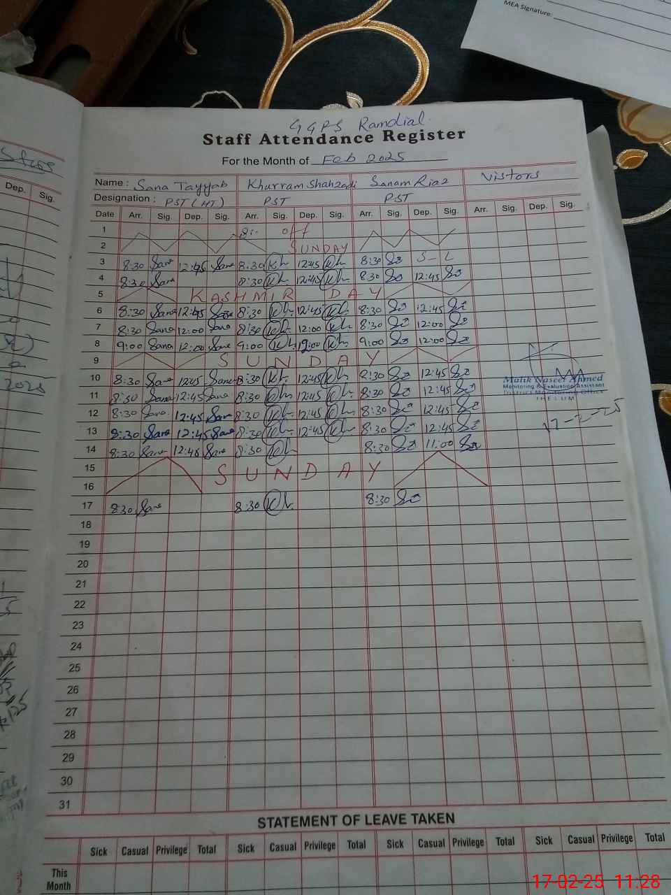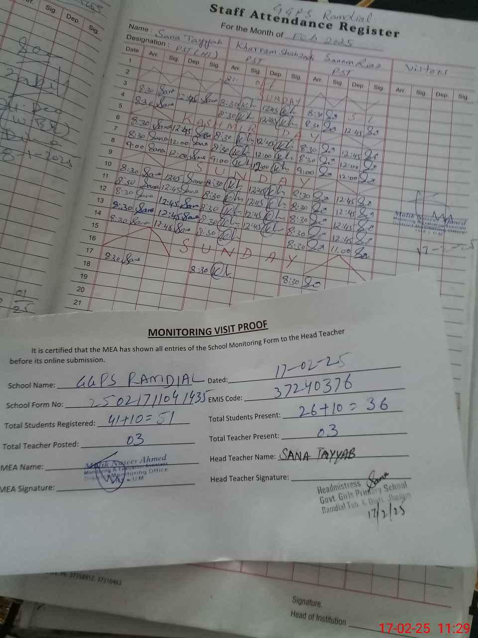 | Attendance Register | Head Teacher | MEA with School | Visit Proof |