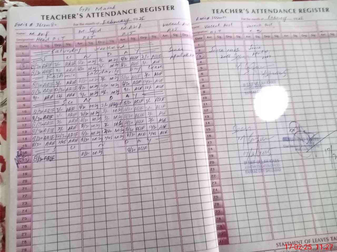 | Name: MAr**** Designation: (School Headmaster's/Headmistress's) PST Phone/Cell Number: 03**** |