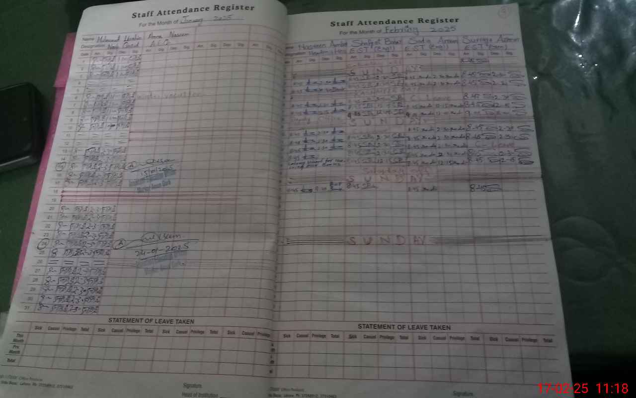 | CNIC | Full Name | Designation | R/C | Absence During Last Calender Month |