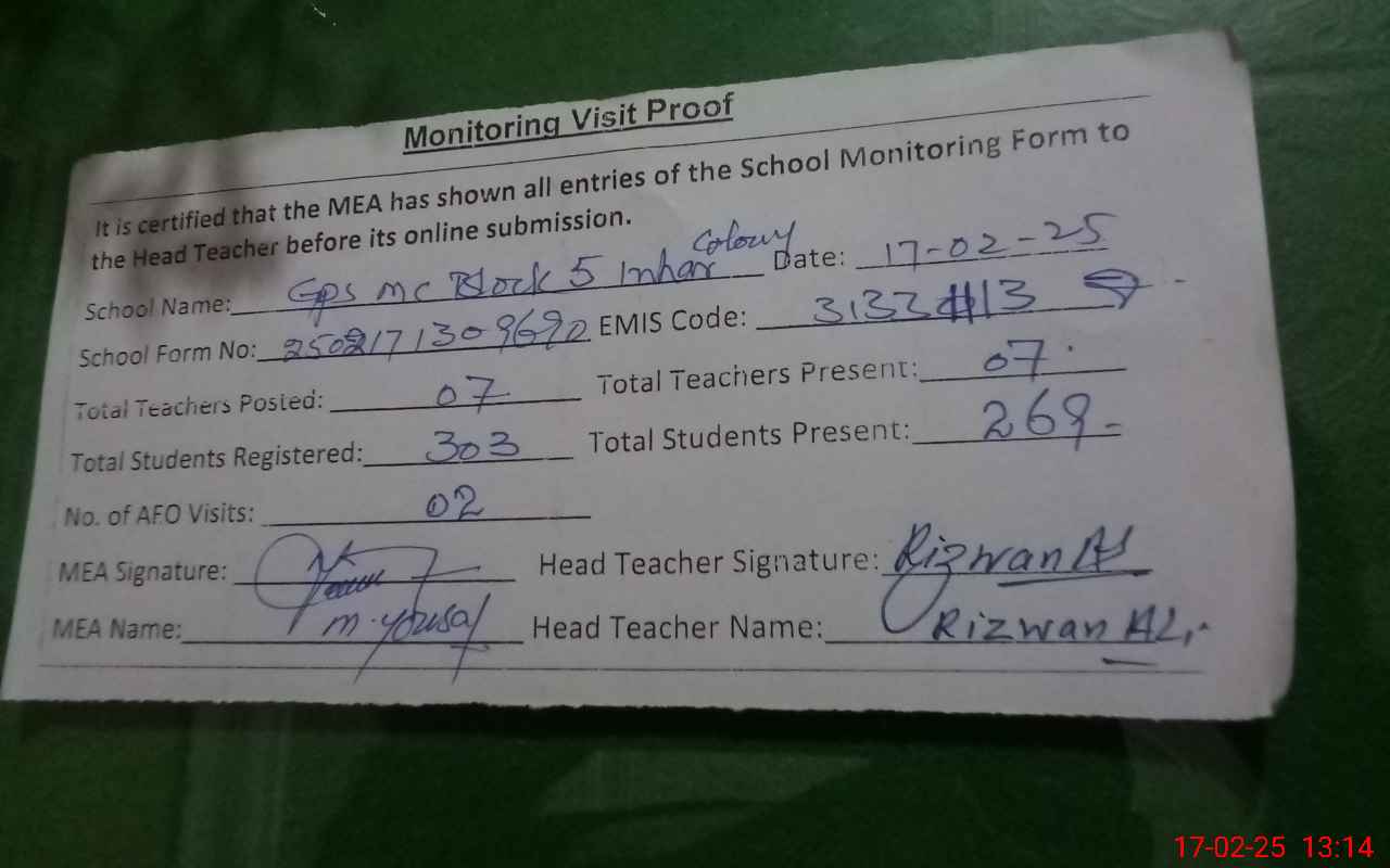 | EMIS Code: 31331113 | Name of School: GPS MC BLOCK NO. 5 INHAR COLONY | |||