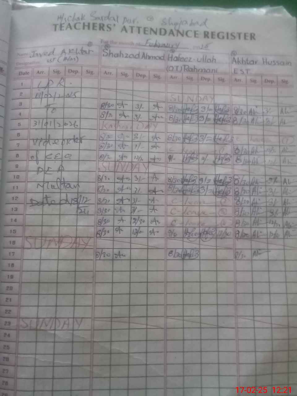 | CNIC | Full Name | Designation | R/C | Absence During Last Calender Month |
