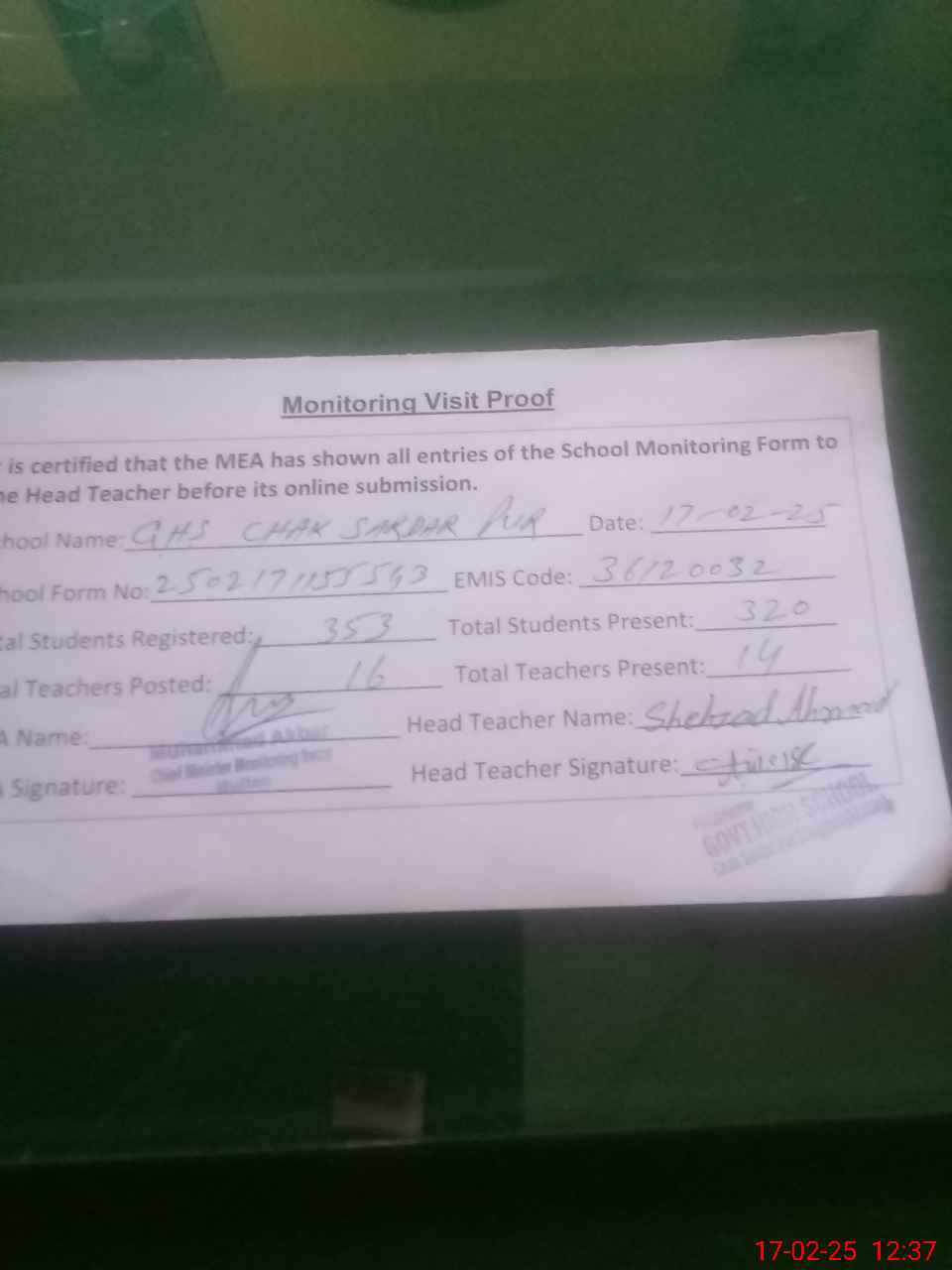 | Attendance Register | Head Teacher | MEA with School | Visit Proof |