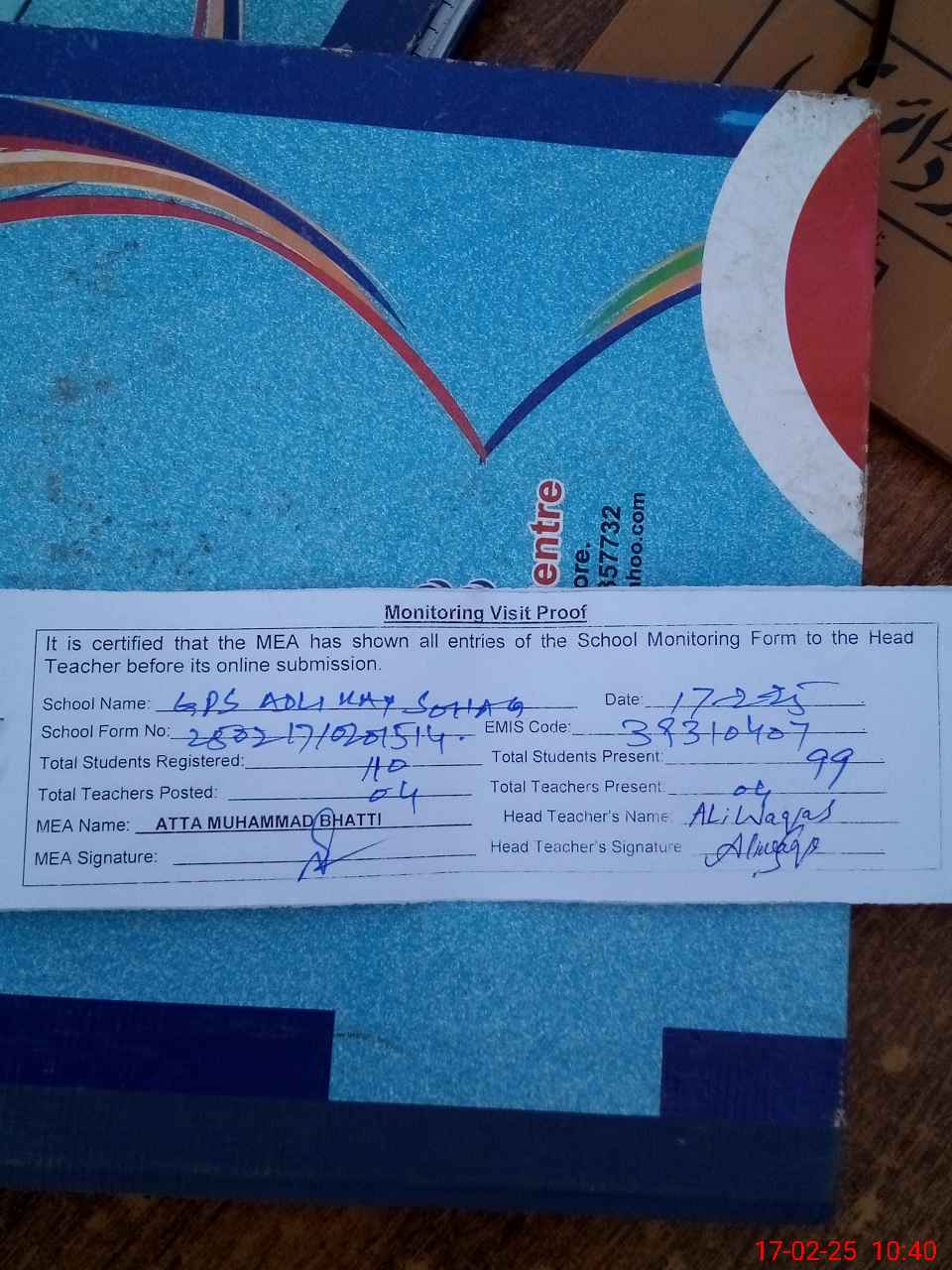 | Attendance Register | Head Teacher | MEA with School | Visit Proof |